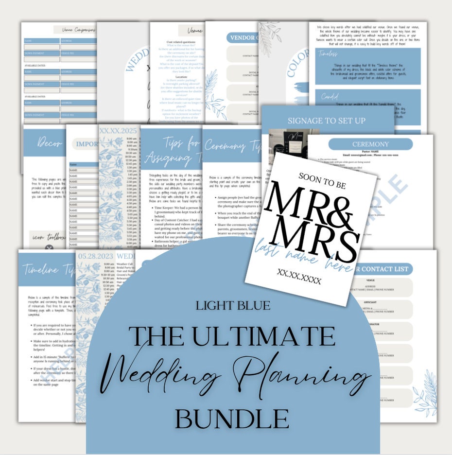 The ultimate wedding planning bundle, filled with templates for inspiration, contact lists, budgeting sheets, vendor information pages, seating charts, decor set up, planning checklists, timelines with samples, helpful tips, and so much more!