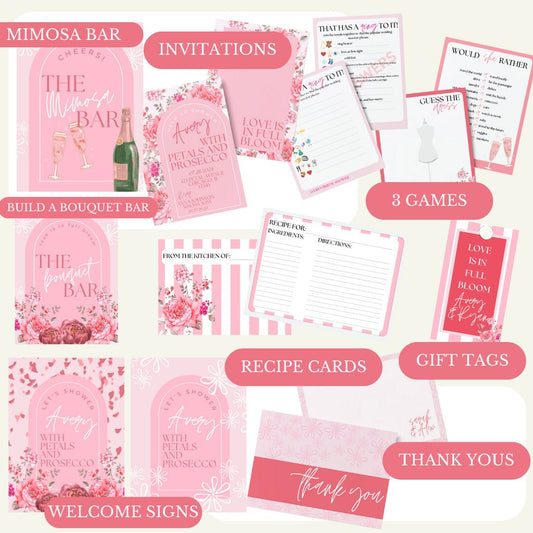 Bridal Shower Kit: "Petals and Prosecco" Customizable Digital Template | Pink | Floral | Recipe Cards | Bridal Shower Signs | Invitations