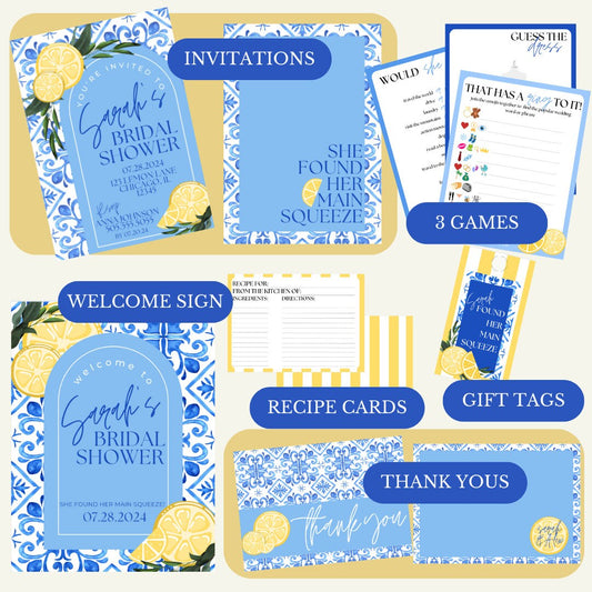 Bridal Shower Kit: "She Found Her Main Squeeze" Customizable Digital Template | Lemons | Yellow and Blue | Recipe Cards | Bridal Shower Sign