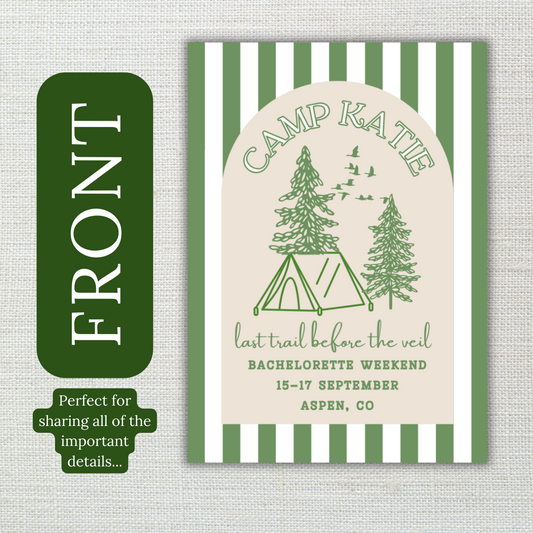 Camp Bachelorette Invitation- last trail before the veil- with Itinerary and Outfit Inspiration Templates