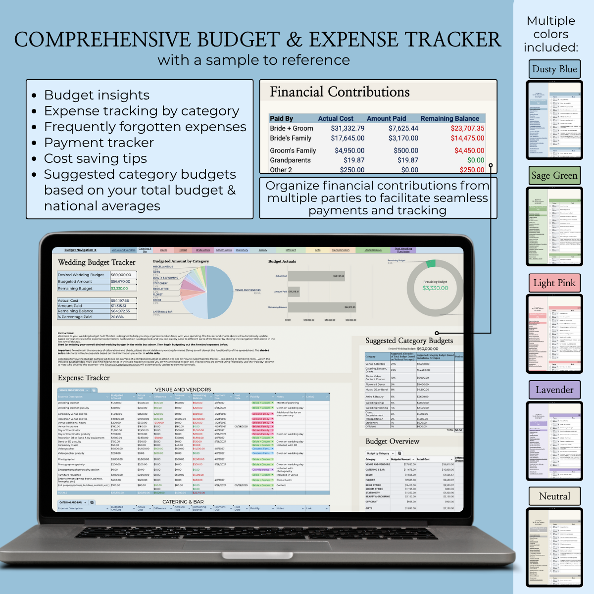 Yes, you can change your spreadsheet to dusty blue, light pink, lavender, sage green, or neutral with one button click! To do so, navigate to the “Tutorials: Start Here” Tab. You can also manually change to any custom color.